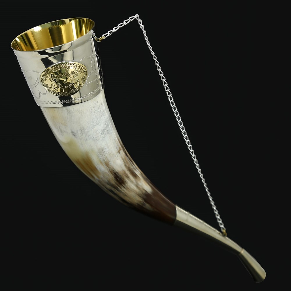Кавказский рог бычий средний (отделка - мельхиор, медальоны - латунь)